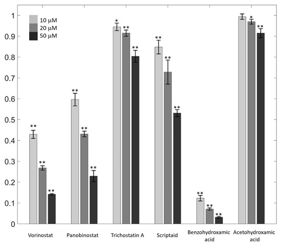 Mammalian-tyrosinase inhibition. B16F10 cell lysates were used to evaluate inhibition against different concentrations of hydroxamate-containing tyrosinase inhibitors. Data are expressed as values relative to those of untreated control cells. Light gray, gray, and dark gray indicate data for inhibitor concentrations of 10, 20, and 50 μM, respectively. Error bars indicate standard deviations for three repeated independent experiments. * and ** indicate statistically significant differences at the levels of p < 0.05 and p < 0.01, respectively, compared with the controls using t-tests.