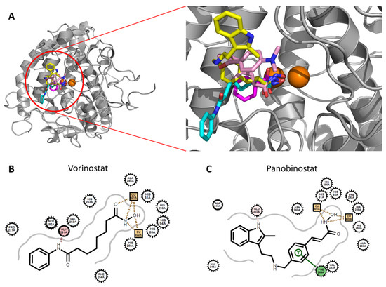 Predicted poses of hydroxamate-containing HDAC inhibitors. (A) Overlaid poses of hydroxamate-containing molecules docked to mushroom tyrosinase. Molecules in cyan, yellow, pink, and magenta indicate vorinostat, panobinostat, trichostatin A, and benzohydroxamic acid, respectively. Brown spheres represent copper atoms. Dockings were performed using Glide-SP with mushroom tyrosinase (PDB ID: 2Y9X) as a template. (B,C) 2D diagrams of docked poses for vorinostat and panobinostat. The OpenEye Grapheme package was used to analyze and visualize intermolecular interactions. For the definition, see Figure S3.