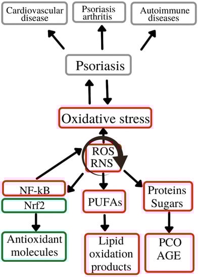 Oxidative stress in the psoriasis evolution. Oxidative stress plays an important role in the initiation and evolution of psoriasis and its associated-comorbidities/complications (cardiovascular diseases, psoriasis arthritis and autoimmune diseases. These complications are generated by the chronic action of ROS and RNS on the main cell constituents (lipids, proteins and carbohydrates), with a secondary activation of molecular pathways (Nrf2, NF-kB) responsible for inducing synthesis of antioxidant molecules (Nrf2) or pro-oxidant enzymes (NF-kB). ROS—reactive oxygen species; RNS—reactive nitrogen species; Nrf2—nuclear erythroid factor 2-related factor 2; NF-kB—nuclear factor kappa light chain enhancer of activated B cells; PUFAs—polyunsaturated fatty acids; AGE—advanced glycation end-products; PCO—protein carbonyl content.
