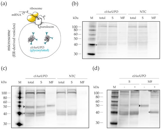 Western blot analyses were done to get information about the localization of the synthesized protein and its relative amount (Figure 3). As a secretory protein, cfAaeUPO was expected to be present in the microsomes, i.e., in ER-derived vesicles. In the case of the A. niger lysate-based CFPS, a band was detected in the microsomal fraction that corresponded to AaeUPO, which has a theoretical molecular weight of 41.5 kDa in its unprocessed form. Overall, the amount of detectable protein was rather low, which explains the relatively low activity. With the N. crassa lysate, two prominent bands could be seen in the whole CFPS reaction mixture. As demonstrated by deglycosylation (Figure 3d), the lower band corresponds to the non-glycosylated (marked with an asterisk) and the upper band to the glycosylated (marked with an arrowhead) form of cfAaeUPO. The larger part of the glycosylated protein was located in the microsomes, while the non-glycosylated UPO was almost exclusively found in the supernatant. Activity measurements of the fractions indicated that the UPO activity stems from the glycosylated form as the ratio of the activities between the fractions correlated with the distribution of synthesized protein (Figure A2). The residual glycosylated cfAaeUPO seen in the supernatant fraction may be the result of an incomplete fractionation process, similarly described in an article by Thoring et al. [41]. They showed that—after centrifugation with 16,000× g—smaller microsomes were still present in the supernatant. The rather high portion of non-glycosylated protein might indicate an insufficient translocation capacity. Nonetheless, the successful expression of active AaeUPO proves that our fungal lysates contain functional microsomes that allow appropriate post-translational modification of secretory proteins.