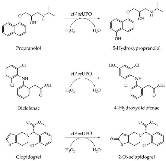 The β-adrenergic blocker propranolol, the non-steroidal anti-inflammatory drug diclofenac, and the antithrombotic prodrug clopidogrel are known to be metabolized by cytochrome P450 monooxygenases in the human body. In previous studies, it was shown that wtAaeUPO is able to perform the same reactions to give the (major) human drug metabolites 5-hydroxypropranolol, 4′-hydroxydiclofenac, and 2-oxoclopidogrel, respectively (Figure 5) [15,40,52].