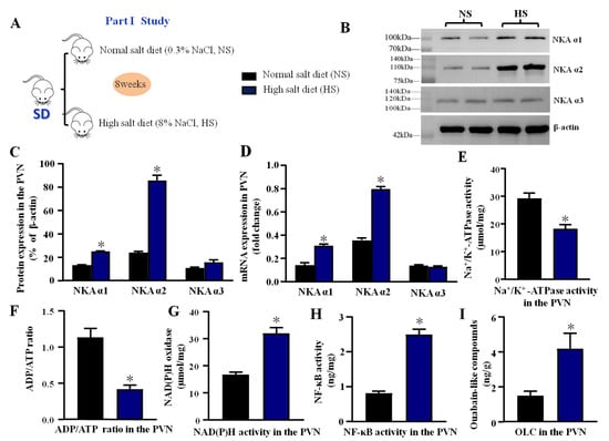 Male SD rats (200–230 g) were fed a normal salt diet (0.3% NaCl) or high salt diet (8% NaCl). After eight weeks, all rats were intraperitoneally anesthetized with ketamine (90 mg/kg) and xylazine (10 mg/kg) (i.p.). Microdissection procedures were used to isolate the PVN tissue, which was collected from both sides of the PVN of individual rats and stored at −80 °C for molecular analyses. Moreover, the protein expression and mRNA levels of NKA subunits (α1, α2, and α3) in the high salt group and control group were measured by Western blotting and real-time PCR. ELISA was used to measure the Na+/K+-ATPase activity, ADP/ATP ratio, ouabain-like compound (OLC), NAD(P)H activity, and NF-κB activity in the PVN.