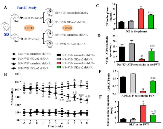 Effect of decreased NKA α2 in the PVN on mean arterial blood pressure, sympathetic activity, NKA, and ADP/ATP ratio in salt-induced hypertension. (A) The flow charts for Part II study. (B) The line chart of MAP in different groups. (C) The histogram of noradrenaline (NE) in the plasma. (D) Na+/K+-ATPase activity in the PVN. (E) ADP/ATP ratio. (F) Ouabain-like compounds (OLC) level in the PVN in different groups. * p < 0.05 versus the normal salt groups (the normal salt + NKA α2 shRNA or normal salt + scrambled shRNA group); # p < 0.05, the high salt + NKA α2 shRNA group versus the high salt + scrambled shRNA group. Values are expressed as the mean ± SEM (n = 6).