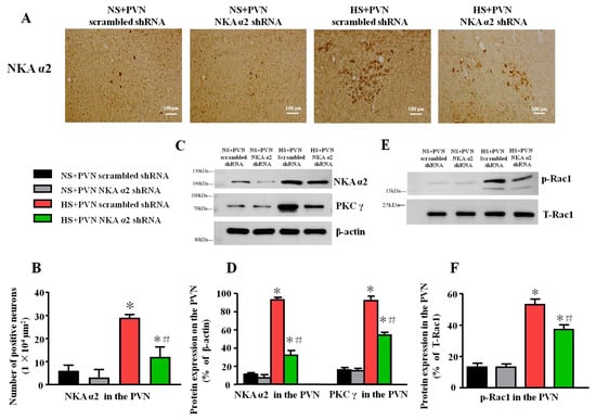 Because PKC γ/Rac1/NAD(P)H is a close signal pathway regarding oxidative stress in the PVN in salt-induced hypertension, the high salt diet increases the expression of NKA α2, PKC γ, and p-Rac1 in the PVN compared to vehicle. After microinjection of NKA α2 shRNA in the PVN, the expression of NKA α2 was lower in this group relative to the group with microinjection of scrambled shRNA in the PVN (p < 0.05). Meanwhile, the expression of PKC γ in the HS+PVN NKA α2 shRNA was lower than the HS + PVN scrambled shRNA (p < 0.5) (Figure 3C,D). In addition, the p-Rac1 protein expression was lower in the HS + PVN NKA α2 shRNA than in the HS + PVN scrambled shRNA (p < 0.05) (Figure 3E,F).
