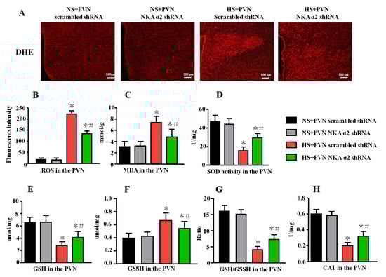 The level of malondialdehyde (MDA), glutathione (GSH), oxidized glutathione (GSSH), GSH/GSSH ratio, catalase (CAT), and superoxide dismutase (SOD) activity in the PVN were measured using ELISA. A high salt diet increased the level of MDA and GSSH but decreased the levels of GSH, GSH/GSSH ratio, CAT, and SOD activity (p < 0.05). After microinjection of NKA α2 shRNA into the PVN of hypertensive rats, the level of MDA and GSSH were lower (Figure 4B, p < 0.05). However, the levels of SOD, GSH, GSH/GSSH ratio, and CAT were higher in the NKA α2 shRNA-microinjected group than them in the hypertensive group (Figure 4C–E, p < 0.05).