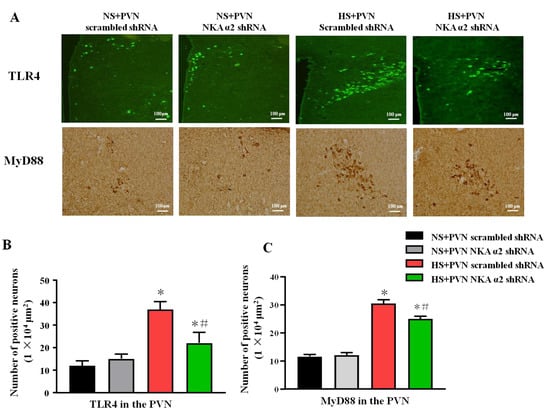 Effect of decreased NKA α2 expression in the PVN on the expression of TLR4, NF-κB p65 in rats with salt-induced hypertension. After microinjection of NKA α2 shRNA in the PVN, we measured the protein expression of TLR4 and MyD88 via immunohistochemistry and immunofluorescence. (A) Immunofluorescence for TLR4 and immunohistochemistry for MyD88 in the PVN in different groups. (B,C) Column diagram showing the effects of NKA α2 shRNA microinjections on the number of TLR4 and MyD88 positive neurons in the PVN in different groups. * p < 0.05 versus the normal salt groups (the normal salt + NKA α2 shRNA or normal salt + scrambled shRNA group); # p < 0.05, the high salt + NKA α2 shRNA group versus the high salt + scrambled shRNA group. Values are expressed as the mean ± SEM (n = 6).