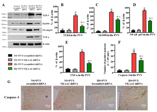 Effect of decreased NKA α2 expression in the PVN on the expression of TLR4, MyD88, NF-κB p65, and TNF-α in rats with salt-induced hypertension. (A) A representative immunoblot densitometric analysis of protein expression of TLR4, MyD88, NF-κB p65, and TNF-α in the PVN in different groups. (B–E) Column diagram showing the effects of microinjections NKA α2 shRNA in the PVN on the protein expression of TLR4, MyD88, NF-κB p65, and TNF-α. (F,G) Immunohistochemistry and column diagram showing the effects of NKA α2 shRNA microinjections on the number of Caspase-3 positive neurons in the PVN in different groups. * p < 0.05 versus the normal salt groups (the normal salt + NKA α2 shRNA or normal salt + scrambled shRNA group); # p < 0.05, the high salt + NKA α2 shRNA group versus the high salt + scrambled shRNA group. Values are expressed as the mean ± SEM (n = 6).