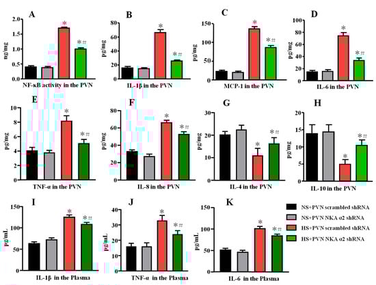 Effect of decreased NKA α2 expression in the PVN on cytokine levels in rats with salt-induced hypertension. (A) NF-κB activity in the PVN. (B) The PVN level of interleukin 1β (IL-1β). (C) The PVN level of Monocytechemoattractantprotein-1 (MCP-1). (D) The PVN level of IL-6. (E) The PVN level of TNF-α. (F) The PVN level of IL-8. (G) The PVN level of IL-4. (H) The PVN level of IL-10. (I) The plasma level of IL-1β. (J) The plasma level of TNF-α. (K) The plasma level of IL-6 in the different groups. * p < 0.05 versus the normal salt groups (the normal salt + NKA α2 shRNA or normal salt + scrambled shRNA group); # p < 0.05, the high salt + NKA α2 shRNA group versus the high salt + scrambled shRNA group. Values are expressed as the mean ± SEM (n = 6).