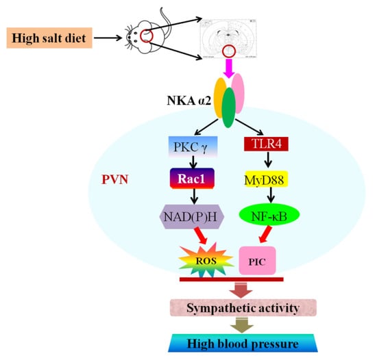 In addition, Jiang et al. (2018) reported that a high salt diet augments sympathetic nerve activity and arterial blood pressure by increasing the PIC levels in the PVN [46]. The NKA pump also regulates the neuroinflammatory responses in microglia cells [11], which are important for modulating neuroinflammatory responses in the brain. Several studies have reported that toll-like receptors (TLRs), specifically TLR4, modulate the inflammatory signaling pathway [47,48]. Our previous results confirmed that the TLR4/MyD88/NF-κB signaling pathway in the PVN regulates the downstream transcription factors of cytokines in the context of hypertension [27]. We also showed that high salt intake suppressed NKA activity in the PVN, and upregulated TLR4, MyD88, and NF-κB p65 expression so as to decrease the levels of PICs in the PVN. However, bilateral microinjection of NKA α2 shRNA into the PVN reversed changes in the TLR4-dependent pathway and PICs expression and decreased sympathetic activity and blood pressure. Hence, NKAα2 regulates the TLR4/MyD88/NF-κB signaling pathway and induces the PVN neuroinflammatory responses in the PVN, thus elevating blood pressure and sympathetic activity in the context of salt-induced hypertension.