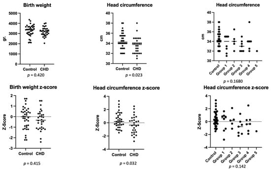 | Head circumference z-score | 0.38 ± 1.17 | −0.29 ± 1.3 | 0.044 |