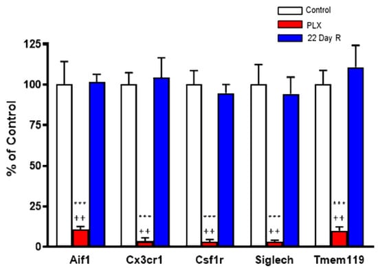 Effect of PLX5622 (PLX) treatment on microglial marker genes. Wild-type controls and PLX5622: n = 6 each; 22-day recovery (R): n = 3. Data (mean ± SEM) are expressed as a percentage of control values. See text for experimental details. *** p < 0.01 vs. control, ++ p < 0.05 vs. 22-day recovery (Kruskal–Wallis test with Dunn’s test for multiple pairwise comparisons).