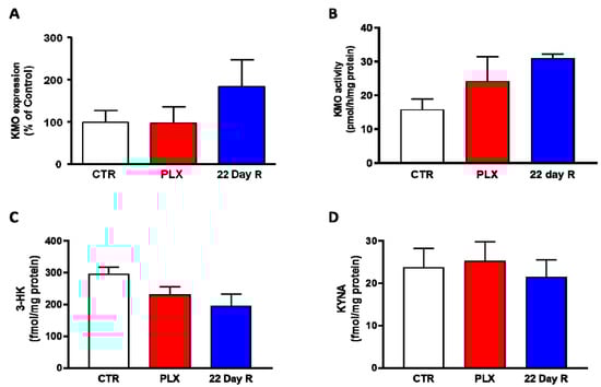 In the same animals, neither Kmo expression nor KMO activity were significantly changed in the forebrain immediately after the treatment with PLX5622 or after a 22-day recovery period (Figure 3A,B). Forebrain 3-HK and KYNA levels, too, were not significantly affected by PLX5622 immediately after the treatment was terminated or 22 days later (Figure 3C,D).