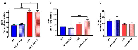 Effect of PLX5622 (PLX) on KMO activity (A), 3-HK (B) and KYNA (C) levels in the forebrain of wild-type (WT) and R6/2 mice. Data are the mean ± SEM (n = 10 per group). See text for experimental details. *** p < 0.001 (Kruskal–Wallis test with Dunn’s test for multiple pairwise comparisons).