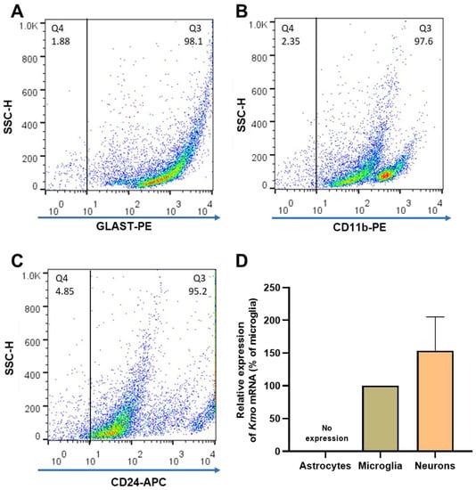 (A–C) Representative dot plots of side scatter height (SSC-H) vs. its corresponding marker, illustrating the purity of brain cells that were isolated from 6 separate mouse brains. After magnetic cell separation, the purity of astrocytes (GLAST-PE+), microglia (CD11b-PE+) and neurons (CD24-APC+) was evaluated by flow cytometry; (D) Kmo mRNA, determined by RT-qPCR. Data are the mean ± SEM. See text for experimental details.