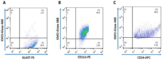 Next, KMO protein in these cells was examined by flow cytometry and immunofluorescence. In line with the Kmo mRNA expression data described above, double-staining revealed that less than 4% of GLAST+ cells, i.e., astrocytes, were KMO-positive (Figure 6A) whereas KMO was present in 95% of CD11b+ (Figure 6B) and 90% of CD24+ (Figure 6C) cells. Representative microscopic images of the cells, using anti-CD11b-PE, anti-NeuN-Alexa 488 and anti-GFAP-Cy3 antibodies to selectively stain microglia, neurons and astrocytes, respectively, are shown in Figure 7.