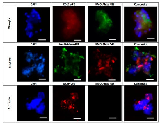 Representative images illustrating the presence of KMO protein in freshly isolated microglial cells (CD11b-PE: red), neurons (NeuN-Alexa 488: green) and astrocytes (GFAP-Cy3; red). Nuclei were stained with DAPI (blue). KMO was identified using anti-rabbit Alexa 488 in microglia and astrocytes, and anti-rabbit Alexa 549 in neurons, as secondary antibodies. See text for experimental details. Images were acquired at 40× magnification. Scale bars: 20 µm.