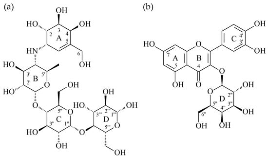 For the comparison of the binding modes of hyperoside and acarbose, hyperoside can reside in the middle of the substrate binding pocket and its D ring is located at the entrance of the pocket to block the entrance and enhance its inhibitory effect. For acarbose, its A ring can be located in a similar position as the A ring of hyperoside but its D ring partially protrudes out of the substrate-binding pocket. For their hydrophilic interactive binding mode (Figure 3b), the A rings of hyperoside and acarbose exert similar binding modes. The B and C rings of hyperoside not only make significant hydrophilic but also hydrophobic interactions with the residues in the middle of the substrate-binding pocket. The B and C rings of acarbose exert only one hydrophilic interaction and they are surrounded by some hydrophobic residues including Tyr 158, Phe 159, and Phe 178; thus, their numerous hydroxyl moieties might not be able to exhibit significant hydrophobic interactions as the B ring of hyperoside. Moreover, the D ring of hyperoside resides at the entrance of the substrate-binding pocket to block the entrance through two essential H-bond interactions but the D ring of acarbose protrudes out of the pocket and exerts its interactions with the residues outside of the pocket. The interaction with the residue in the pocket should contribute more to the antagonistic effect than that with the residue out of the pocket. All modeling results shown above highly indicate that acarbose might have a lesser antagonistic effect than hyperoside due to the difference in the binding mode. However, to generate the crystal structure of the α-glucosidase from Saccharomyces cerevisiae complexed with hyperoside or acarbose is needed to further establish the nature of their respective interaction.