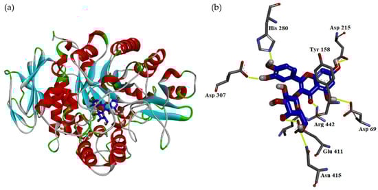 As shown in Figure 3a, the docking model of hyperoside indicated that hyperoside did not enter the active site in the flat conformation due to the narrow entrance. Alternatively, the A ring of hyperoside leaned toward the binding position of α-D-glucopyranose and the D ring of hyperoside located nearby the entrance of the active site. Importantly, hyperoside made some significant hydrophilic interactions, including the following: (1) the 5-hydroxyl and 7-hydroxyl groups on the A ring both served as the H-bond donors to interact with Asp 69 and Asp 215, respectively; (2) the 4-keto group on the B ring behaved as the H-bond acceptor to make contact with Arg 442; (3) both 3′-hydroxyl and 4′-hydroxyl groups on the A ring acted as the H-bond donors to interact with His 280 and Asp 307 respectively; and (4) the 5′′-hydroxyl group on the D ring acted as the H-bond donor to interact with Glu 411 and the 6′′-hydroxymehtyl group also on the D ring behaved as the H-bond acceptor to contact with the amido side chain of Asn 415. Apart from hydrophilic interaction, hyperoside also made important hydrophobic contact: the π–π interaction between its B ring and Tyr 158.