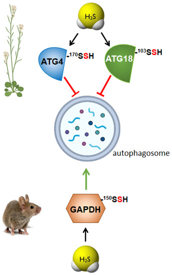 The role of persulfidation as the underlying mechanism regulating autophagy through sulfide was demonstrated in the ATG4 protease, which was specifically modified by persulfidation of Cys170 residue, negatively regulating [46] (Figure 2). These authors established that persulfidation of ATG4 upon sulfide treatment inhibited its protease activity, disabling the progress of autophagy. They also revealed that an increase in the intracellular level of the plant hormone abscisic acid (ABA) triggered a decrease in the persulfidated ATG4 level; consequently, its protease activity was enhanced, activating the processing of ATG8, which was further lipidated, and, as a result, autophagy was induced.