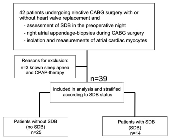 Patient flow chart. After screening, 39 patients were included in the analysis. Abbreviations: CABG, coronary artery bypass graft; CPAP, continuous positive airway pressure; SDB, sleep-disordered breathing.