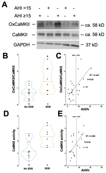 Increased oxidation and activity of CaMKII in patients with SDB. Original Western blot (A) and mean densitometric data (B) investigating the expression of oxidized CaMKII relative to CaMKII expression. Compared to control patients (no SDB), there was a significant increase in the level of oxidized CaMKII (oxCaMKII/CaMKII) in patients with SDB. (C) Scatter plot for the correlation of AHI and oxCaMKII/CaMKII. Linear regression analysis is shown as line plot. Mean densitometric data (D) for the assessment of CaMKII activity by using specific HDAC4 pulldown. There was a significant increase in CaMKII activity in patients with SDB. (E) Scatter plot for the correlation of AHI and CaMKII-activity. Linear regression analysis is shown as line plot. * p < 0.05 vs. no SDB (t-test).
