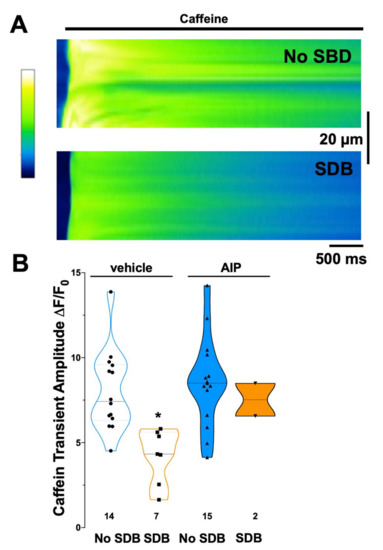 Patients with SDB display reduced SR Ca content. (A) Original confocal line scans of Fluo–4 loaded atrial cardiomyocytes rapidly exposed to caffeine (10 mmol/L). The measured fluorescence intensity was color coded according to the calibration bar. (B) Mean data for caffeine-induced Ca transient amplitude ΔF/F0 as a measure of SR Ca content. Compared to control patients (no SDB), the caffeine-transient amplitude was significantly lower in patients with SDB. Interestingly, the presence of AIP did not alter the caffeine-transient amplitude in patients without SDB. In contrast, in patients with SDB, there was a trend towards an increase in caffeine–transient amplitude in the presence of AIP. * p < 0.05 vs. no SDB (two–way RM ANOVA, mixed effects model).