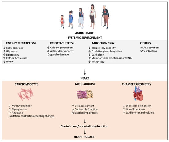 Several genetic, molecular and biochemical abnormalities are involved in the structural and functional myocardial changes during aging [9,26,35,36,37]. These abnormalities are mainly characterized by changes in contractile proteins and cardiac excitation-contraction coupling, decreased contractile response to β-adrenergic stimulation, increased systemic and myocardial oxidative stress and renin–angiotensin activity, and metabolic changes [3,26,27].