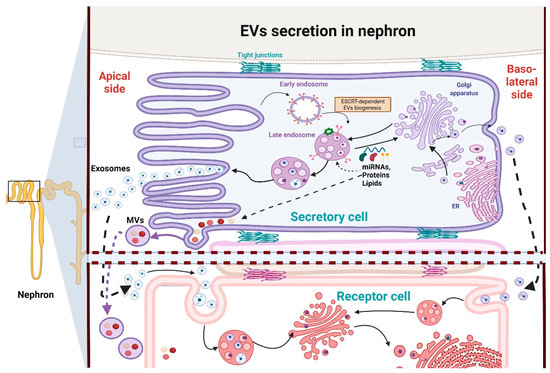 Extracellular vesicles’ (EVs) secretion in nephron segments. In the nephrons, the exosomes and microvesicles (MVs) are strongly affected by the polarity of the cells, especially in a tubular section such as the proximal tubule. Although both the apical and basolateral EVs use components of endosomal sorting complexes required for transport (ESCRT) machinery, the final composition of lipids, proteins, and genetic material is different between them. For example, apical EVs are more enriched in CD24 and lipids such as cardiolipin, ceramide, and phospholipids than basolateral counterparts. Additionally, the apical side releases 3-fold more exosomes under healthy physiological conditions than the basolateral side. EVs allow communication between distant nephron segments since the EVs released from upper nephron segments can be taken in by the cells in lower segments. Image created with Biorender.
