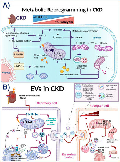 On the other hand, EVs also carry a variety of metabolites and proteins that regulate the metabolism in recipient cells. Therefore, MVs and exosomes can regulate mitochondrial bioenergetics, biogenesis, redox state, mitophagy, and dynamics in the targets cells [89]. In this way, it is widely characterized that cancer-derived exosomes have the ability to induce metabolic reprogramming in non-cancer cells [19,90]. For example, exosomes secreted by cancer-associated fibroblasts induce the inhibition of ETS, OXPHOS, and oxygen consumption, while at the same time increasing glycolysis and glutamine utilization by the exosome-absorbing cells [19]. Interestingly, high glucose conditions, such as in diabetic nephropathy (DN), can substantially increase EVs’ production with differences in their molecular composition [91]. Furthermore, proteomic studies show that glycolytic enzymes are among the 100 most frequently identified proteins in exosomes and other EVs [92], which suggests that some EVs have a strong ability to induce the prevalence of glycolytic metabolism in their recipient cells [18] (see Figure 2B). The ability of EVs to switch metabolism to glycolysis is associated with hypoxia, which triggers not only changes in the amount of secreted EVs but also in their contents and corresponding functions [89]. For example, hypoxia-derived exosomes contain chemokines, proteins, metabolites, and miRNAs such as miR-21 and miR-17, which promote mitochondrial impairment in recipient cells and subsequent inflammation [53,56,57,89,93]. The exosome-mediated metabolic reprogramming related to hypoxia is not limited to cancer cells [89,94,95]. In fact, in CKD, the hypoxia-inducible factor 1-alpha (HIF1α) is a key regulator of EVs’ production [17,51,95]. HIF-1α promotes glycolytic reprogramming by inducing pyruvate dehydrogenase kinase 1 (PDK1), inhibiting pyruvate dehydrogenase (PDH) and mitochondrial OXPHOS.