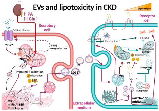 Extracellular vesicles (EVs) and lipotoxicity in CKD. In CKD, the increase in fatty acid levels such as palmitic acid (↑PA) or high glucose (↑[Glu]) concentrations favors the excretion of EVs by activation of the membrane Ca2+ (calcium) channels; the cytosolic overload of Ca2+ favors the uptake of this ion by the mitochondrial Ca2+ uniporter which induces ROS production increase and mitochondrial-derived vesicles’ (MDVs) formation. High levels of PA and ROS induce β-oxidation impairment and, later, accumulation of lipid droplets (LDs) enriched with PA. The LDs’ components and proteins involved in fatty acids’ uptake, such as CD36, are loaded into EVs. Additionally, miRNA-155 and mRNA of transforming growth factor-beta 1 (TGF-β1) are also found in the multivesicular bodies that are secreted as exosomes. Once internalized, EVs release their cargo, such as CD36, which promotes lipid uptake and inflammation in recipient cells. The components of MDVs together with the lipids released in target cells, mainly PA and oleic acid (OA) fatty acids, favor the accumulation of LDs and mitochondrial impairment. Furthermore, PA accumulation also inhibits mitochondria, favoring the accumulation of damaged mitochondria and triggering fibrosis. Image created with Biorender.
