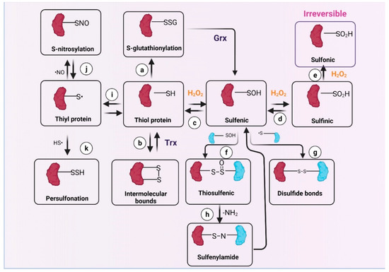 Reactive oxygen species (ROS) induce post-translational modifications in cysteine (Cys) residues that participate in redox signaling. ROS oxidize Cys residues containing thiol groups, forming (a) S-glutathionylation (R–SSG), reversed by glutaredoxin (Grx) enzymes. Thiols also can form (b) intermolecular bonds, modification reversed by thioredoxin (Trx) system; however, ROS can prompt (c) sulfenic form (R–SOH) by suffering oxidation with hydrogen peroxide (H2O2). If oxidated by H2O2, R-SOH can give place to (d) sulfinic (R–SO2H) or (e) sulfonic form (R–SO3H); the latter is irreversible. Additionally, the oxidation of R–SOH might form (f) thiosulfenic [R–S(O)–S-R’] by interacting with another protein containing R-SOH modification or with a protein that contains a thiol group (R–S•) to form (g) disulfide bonds (R–S–S–R’). R–S(O)–S-R’ might interact with amide (–NH2) groups, forming (h) sulfenylamide (R–SN–R′), which can be reversed to R–SOH form. On the other hand, an alkaline environment gives rise to deprotonated R-SH protein: (i) R–S•, which can be modified with nitrosothiol groups (•NO), giving rise to (j) S-nitrosylation (R-SNO) or can be modified with hydrogen sulfide (H2S), forming (k) S-persulfonation (R–S–S–H). The red symbols indicate protein 1 that suffers a redox modification in Cys residues, and blue symbols indicate protein 2 that suffers other redox modifications. Image created with Biorender.