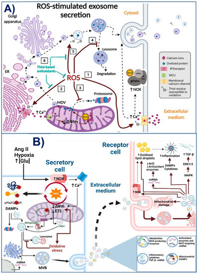 The cells under oxidative stress can transfer via EVs, signaling pathways to spread metabolic changes and cell death in recipient cells [162]. Therefore, it was considered that after oxidative stress, oxidized proteins are usually degraded via the ubiquitin-proteasome pathway or by autophagy. However, when there is an impairment in these pathways, EVs can also serve as an alternative mechanism to remove oxidized proteins by transferring them to other cells, triggering oxidative stress in the last ones [145]. For example, PRX is secreted via EVs; in fact, PRXs contain cysteine residues that need to be oxidized before their inclusion in exosomes; therefore, the inclusion of PRX1 in EVs could be used by cells to eliminate the oxidized PRX protein [163]. This intercellular redox communication via EVs would be fundamental to the progression of several oxidative stress-related diseases, where pro-inflammatory cytokines and immune cell activation are essential for disease development [164,165]. In clinical cases, EVs isolated from the plasma of patients with rheumatoid arthritis or secreted from cells subjected to oxidative stress contained oxidized phospholipids that activate Toll-like receptor 4 (TLR4) [140]. Similarly, aging-related diseases are commonly associated with oxidative stress and inflammation induced by EVs’ release [143]. As we will further discuss, this can be particularly important in CKD, where cell death is promoted along the nephron segments related to oxidative stress [17,51,95]. In target cells, the NF-κB, JNK, and phosphatidylinositol 3-kinase (PI3K)-Akt signaling pathways are usually involved in the pathological changes provoked by ROS-induced EVs [91]. In the kidneys, the ROS increase in podocytes induces the activation of NLR family pyrin domain containing 3 (NLRP3) inflammasomes and the subsequent release of pro-inflammatory exosomes, inducing glomerular inflammation [138]. Similarly, H2O2 in a dose-dependent manner and NOX activation enhance the formation of EVs in podocytes, giving rise to exosomes containing several inflammatory cytokines [138]. Similarly, the Ang II increase is related to EVs’ release induction mediated by NOX, which stimulated endothelial ROS production and inflammatory responses in recipient cells [166]. Mitochondrial impairment could play a key role in releasing these pro-inflammatory EVs; in fact, the drop in ΔΨm by ROS inhibits mitochondrial Ca2+ influx, favoring the increase in the cytosolic Ca2+ concentration and EVs’ release [167]. Likewise, the dysfunction in one or several elements of ETS drops ΔΨm, inducing MVs’ and exosomes’ release [156]. A recent study also showed that mitochondrial ROS production, by the perturbation of IP3-receptors and NOX activation, is required by the transient EVs’ production, containing elevated amounts of IL-1β [139]. Furthermore, mitochondrial damage favors the release of mitochondrial content, especially oxidized components (Figure 5B) that act as DAMPs activating an inflammatory response [168]. These components can be packaged and transported by EVs. This topic will be discussed in the next section.