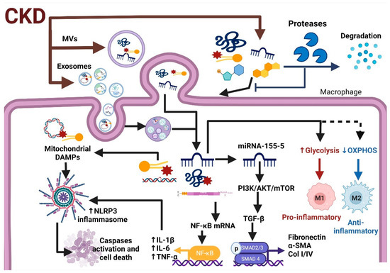 Extracellular vesicles’ (EVs) role in the promotion of inflammation and fibrosis in CKD. Exosomes and microvesicles (MVs) secreted in CKD are enriched with pro-inflammatory factors such as transforming growth factor-beta 1 (TGF-β1) and nuclear factor kappa-light-chain-enhancer of activated B cells (NF-κB). These two factors are the main drivers of inflammation and fibrosis in CKD. Once these EVs are internalized in recipient cells such as macrophages, they increase pro-inflammatory cytokines such as tumor necrosis factor-alpha (TNF-α), interleukin-1 beta (IL-1β), and interleukin 6 (IL-6). Furthermore, mitochondrial DAMPs released by EVs trigger NLR family pyrin domain containing 3 (NLRP3) inflammasome activation and cell death. In addition, miRNA and metabolites released by exosomes induce metabolic reprogramming of macrophages to glycolytic M1 type, the pro-inflammatory type, reducing oxidative phosphorylation system (OXPHOS)-based M2 macrophages, the anti-inflammatory M2 type. Image created with Biorender.