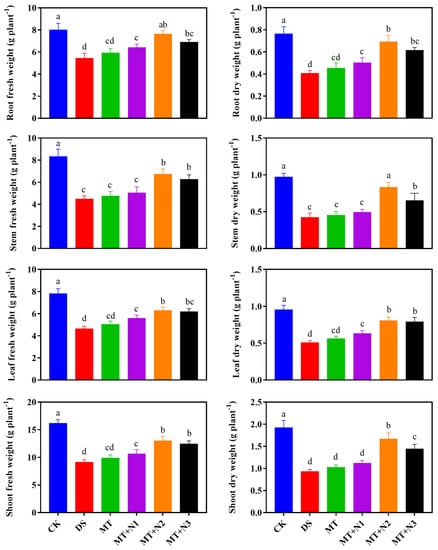The application of melatonin with nitrogen significantly affected the biomass accumulation of maize seedlings under drought-stress conditions compared with MT alone (Figure 1). Drought stress greatly reduced the fresh and dried root, stem, leaf, and shoot biomass of maize seedlings compared to CK (Figure 1). The detrimental effect of drought stress on biomass accumulation was considerably reduced by the combined treatment of melatonin and nitrogen. Our results showed that drought stress reduced the root fresh- and dry weight by 32.36% and 46.76% as compared to the CK. The applications of melatonin with nitrogen treatment (MT + N2) significantly enhanced the root fresh- and dry biomass by 40.53% and 70.11% compared to DS and MT. Similarly, the stem, leaf, and shoot fresh- and dry biomass of maize seedling were dramatically reduced by drought stress compared with CK, while melatonin with the application of nitrogen significantly improved these parameters. Our results, seen in Figure 1, demonstrate that treatment with MT + N2 significantly improved the stem fresh- and dry biomass by 50.52% and 84.30%, leaf fresh- and dry biomass by 35.14% and 59.88%, while the shoot fresh- and dry biomass by 42.68% and 79.19% followed by treatment with MT + N3 as compared to DS and MT. These results revealed that melatonin application combined with nitrogen significantly improved biomass accumulation under drought-stress conditions.