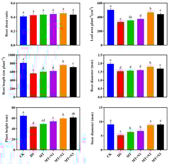 Root to shoot ratio, leaf area, root length and diameter, plant height, and stem diameter of maize seedlings under drought-stress conditions in combination with melatonin in different levels of nitrogen. CK; Well-watered control without melatonin (MT), DS; Drought stress without MT, MT; Drought stress + 100 µM MT, MT + N1; MT 100 µM + 200 kg N ha−1, MT + N2; MT-100 µM + 250 kg N ha−1, and MT + N3; MT-100 µM + 300 kg N ha−1. Vertical bars represent ± S.D. (n = 3, biological replicates). Different letters indicate significant differences as determined by the LSD test (p ≤ 0.05).