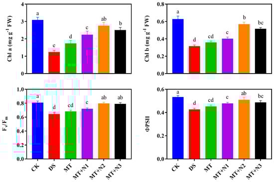 Chlorophyll a, b and chlorophyll fluorescence of maize seedlings under drought-stress conditions in combination with melatonin in different levels of nitrogen. CK; Well-watered control without melatonin (MT), DS; Drought stress without MT, MT; Drought stress + 100 µM MT, MT + N1; MT 100 µM + 200 kg N ha−1, MT + N2; MT-100 µM + 250 kg N ha−1, and MT + N3; MT-100 µM + 300 kg N ha−1. Vertical bars represent ± S.D. (n = 3, biological replicates). Different letters indicate significant differences as determined by the LSD test (p ≤ 0.05).
