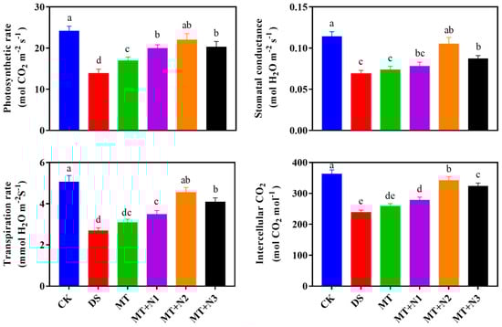 Photosynthetic gas exchange of maize seedlings under drought-stress conditions in combination with melatonin in different levels of nitrogen. CK; Well-watered control without melatonin (MT), DS; Drought stress without MT, MT; Drought stress + 100 µM MT, MT + N1; MT 100 µM + 200 kg N ha−1, MT + N2; MT-100 µM + 250 kg N ha−1, and MT + N3; MT-100 µM + 300 kg N ha−1. Vertical bars represent ± S.D. (n = 3, biological replicates). Different letters indicate significant differences as determined by the LSD test (p ≤ 0.05).