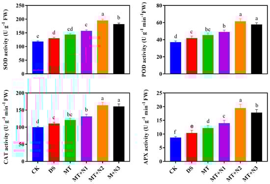 Antioxidant enzyme activities of maize seedlings under drought-stress conditions in combination with melatonin in different levels of nitrogen. CK; Well-watered control without (melatonin) MT, DS; Drought stress without MT, MT; Drought stress + 100 µM MT, MT + N1; MT 100 µM + 200 kg N ha−1, MT + N2; MT-100 µM + 250 kg N ha−1, and MT + N3; MT-100 µM + 300 kg N ha−1. Vertical bars represent ± S.D. (n = 3, biological replicates). Different letters indicate significant differences as determined by the LSD test (p ≤ 0.05).