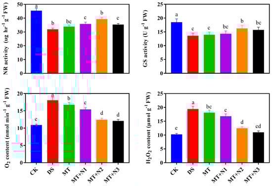 Nitrogen metabolism enzymes NR and GS activity in maize seedling leaves were significantly affected by the combined application of melatonin and nitrogen under drought-stress conditions. Melatonin with nitrogen treatment (MT + N2) increased the NR activity by 6.74%, and GS activity by 19.67% as compared to DS and MT (Figure 6). Overall results showed that melatonin application under drought stress improves the antioxidant enzyme and increases the nitrogen metabolism activity.