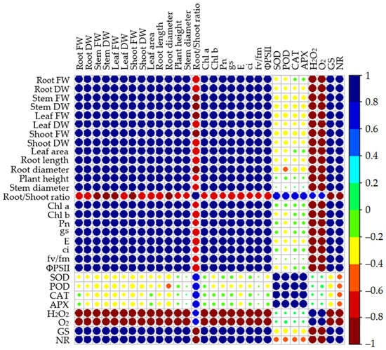 The correlation was carried out to find out the relationship between physiological and biochemical parameters of maize seedlings under drought-stress conditions. Pearson’s correlation analysis results revealed that fresh- and dry biomass, root length and diameter, plant height, leaf area, chlorophyll fluorescence, and photosynthetic gas exchange parameter were significantly high and positively correlated with each other, while the root-to-shoot ratio showed negative correlation (Figure 7). Moreover, antioxidant enzyme activity had a negative correlation, while the nitrogen metabolisms GS and NR had a positive correlation. In addition, the ROS had a strongly negative correlation with the growth parameter of maize seedlings under drought-stress conditions (Figure 7).