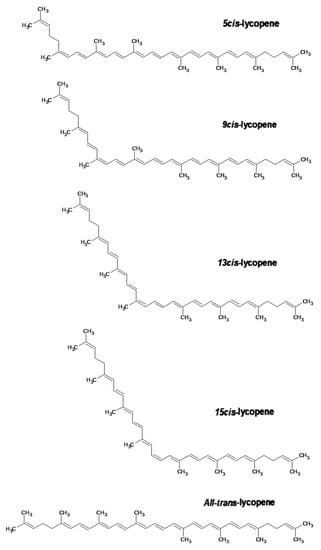 All-trans-lycopene (Figure 2) is interesting for industrial use in food and pharmaceuticals because of its high stability compared to other isomers of lycopene. All-trans-lycopene presents higher color intensity than cis isomers due to its low extinction coefficient. In nature, the trans-lycopene configuration has better stability compared with the cis isomer []. Nevertheless, the industry has also demonstrated interest in cis-lycopene structures (Figure 2) because they seem to have better bio-availability when compared to the all-trans isomer and can also prevent breast and prostate cancer [,,].