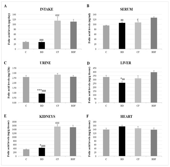 Folic acid homeostasis in the rats’ bodies. Intake levels (A), serum levels (B), urine levels (C) and tissue deposit levels in the liver (D), kidneys (E) and heart (F). The results are expressed as mean ± SEM and analysed by a multifactorial one-way ANOVA followed by Tukey’s test. The number of animals in each group is 6 and n = 12. SEM: standard error of the mean. Groups: C: control group, BD: binge drinking group, CF: control folic group, BDF: binge drinking folic group. Signification: C vs. BD: * p < 0.05, *** p < 0.001; C vs. CF: c p < 0.05, ccc p < 0.001; BD vs. BDF: aa p < 0.01, aaa p < 0.001.