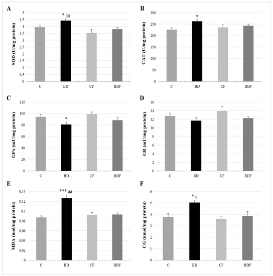 Hepatic oxidative balance: activity of antioxidant enzymes and oxidative stress markers. Superoxide dismutase (SOD) (A), catalase (CAT) (B), glutathione peroxidase (GPx) (C), glutathione reductase (GR) (D), lipid oxidation expressed by the levels of malondialdehyde (MDA) (E) and protein oxidation expressed by the levels of carbonyl groups (CG) (F). The results are expressed as mean ± SEM and analysed by a multifactorial one-way ANOVA followed by Tukey’s test. The number of animals in each group is 6 and n = 12. SEM: standard error of the mean. Groups: C: control group, BD: binge drinking group, CF: control folic group, BDF: binge drinking folic group. Signification: C vs. BD: * p < 0.05, *** p < 0.001; BD vs. BDF: a p < 0.05; aa p < 0.01.