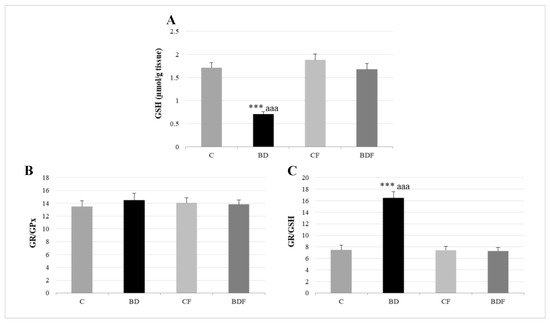 Hepatic GSH levels and their relationship to GPx and GR enzymes. GSH (A), GR/GPx ratio (B) and GR/GSH ratio (C) in the liver. The results are expressed as mean ± SEM and analysed by a multifactorial one-way ANOVA followed by Tukey’s test. The number of animals in each group is 6 and n = 12. SEM: standard error of the mean. Groups: C: control group, BD: binge drinking group, CF: control folic group, BDF: binge drinking folic group. Signification: C vs. BD: *** p < 0.001; BD vs. BDF: aaa p < 0.001.