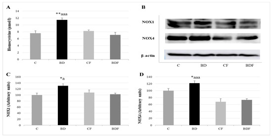 After BD consumption, serum Hcy levels significantly rise (F(3.20) = 6.4, p < 0.01), together with NOX1 and NOX4 liver expression (F(3.20) = 4.7 and 4.3, p < 0.05 to NOX1 and NOX4, respectively). FA supplementation to control animals did not affect any of these parameters; however, FA supplementation to BD rats decreased Hcy levels (F(3.20) = 10.52, p < 0.001) and NOX1 and NOX4 expression (F(3.20) 4.3, p < 0.05 to NOX1, F(3.20) = 9.65, p < 0.001 to NOX4) (Figure 4).