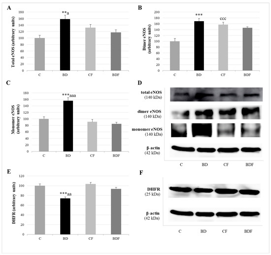 Role of DHFR enzyme in the expression of coupled and uncoupled eNOS in the liver of adolescent rats. Expression of eNOS (expressed as percent arbitrary relative units, referring to values in control animals which were defined as 100%): total eNOS (A), dimer-coupled eNOS (producer of NO) (B) and monomer-uncoupled eNOS (producer of O2•−) (C). Representative Western blot for the expressions of total, dimer and monomer eNOS and β-actin (as load control) (D). Expression of DHFR in the liver of adolescent rats (expressed as percent arbitrary relative units, referring to values in control animals which were defined as 100%) (E). Representative Western blot for the expressions of DHFR and β-actin (as load control) (F). The results are expressed as mean ± SEM and analysed by a multifactorial one-way ANOVA followed by Tukey’s test. The number of animals in each group is 6 and n = 6 for eNOS and DHFR expression determinations. eNOS: endothelial nitric oxide synthase. NO: nitric oxide. O2•−: superoxide anion. DHFR: dihidrofolate reductase. SEM: standard error of the mean. Groups: C: control group, BD: binge drinking group, CF: control folic group, BDF: binge drinking folic group. Signification: C vs. BD: ** p < 0.01, *** p < 0.001; C vs. CF: ccc p < 0.001; BD vs. BDF: a p < 0.05, aa p < 0.01, aaa p < 0.001.