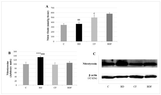 BD exposure did not increase NO hepatic levels, but it did increase the expression of proteins with nitrotyrosine (F(3.20) = 9.5, p < 0.001). FA supplemented to control rats increased the amount of NO without affecting nitrotyrosine expression (F(3.20) = 4.2, p < 0.05). FA supplemented to BD rats increased NO hepatic levels and significantly decreased nitrotyrosine expression in hepatic proteins (F(3.20) = 5.8, p < 0.01 for NO levels, F(3.20) = 7.7, p < 0.001 for nitrotyrosine expression), avoiding nitrosative damage (Figure 6).