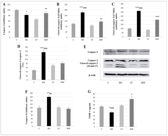 Relative to apoptotic studies (Figure 7), BD-exposed animals presented lower caspase-3 levels but higher cleaved caspase-3 expression, leading to a high ratio of cleaved caspase-3/caspase-3 (F(3.20) = 11.7, p < 0.001). When FA was supplied, this ratio significantly decreased (F(3.20) = 7.9, p > 0.001); however, these animals (BDF) present higher caspase-3 and cleaved caspase-3 than their control counterparts (CF) without differences in the final ratio. BD animals also present higher cleaved caspase-9 expression (F(3.20) = 6.2, p < 0.01) and lower serum levels of the anti-apoptotic TIMP-1. When FA was supplemented, BDF rats presented lower caspase-9 expression (F(3.20) = 9.96, p < 0.01) and higher levels of TIMP-1 (F(3.20) = 10.5, p < 0.001), even higher than CF rats (F(3.20) = 4.9, p < 0.05).