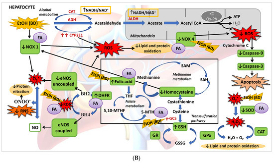 The relationship between folic acid (FA), chronic ethanol consumption (Chr-EtOH) and alcoholic liver disease (ALD) is well recognized in clinical and experimental research. Chr-EtOH suppresses key biological processes directly relevant to FA and folate metabolism, such as folate intestinal absorption, liver uptake and storage, urinary excretion, and folate enzymes synthesis and methylation; it also leads to lower folate intake [1]. Therefore, currently, FA is supplied to Chr-EtOH patients in order to prevent ALD, as this is the main vitamin deficiency from which they suffer [2].