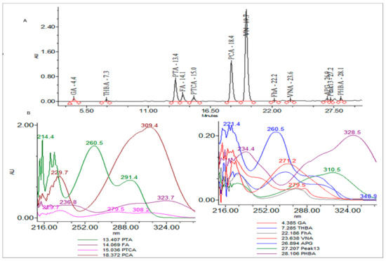 (A) Chromatogram of high-pressure liquid chromatography equipped with diode array detector (HPLC-DAD) at 280 nm and (B) extracted spectrum (200–400 nm) of each peak.